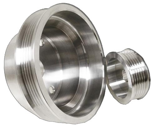 The pulley will fit The pulleys are CNC-machined from the lightest, most durable materials possible; 6061-T6 aluminum billet. The pulley are 25 percent underdrive. The crank pulley are in 5 7/8" diameter. The Alternator pulley are in 3" diameter.